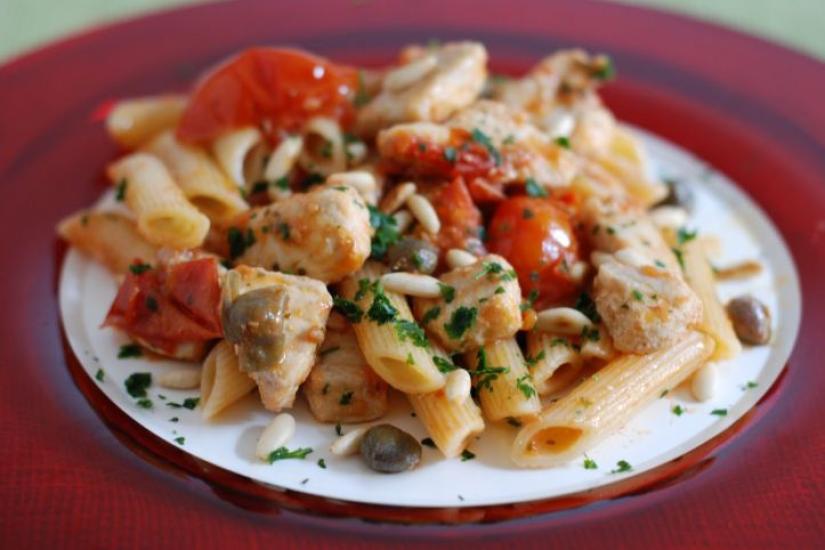 Pasta with swordfish and Pachino cherry tomato - Ingredients: 200 grams of pasta penne; 2 slices of swordfish, cut into cubes, and without the skin; 8 Pachino cherry tomatoes; parsley to…
